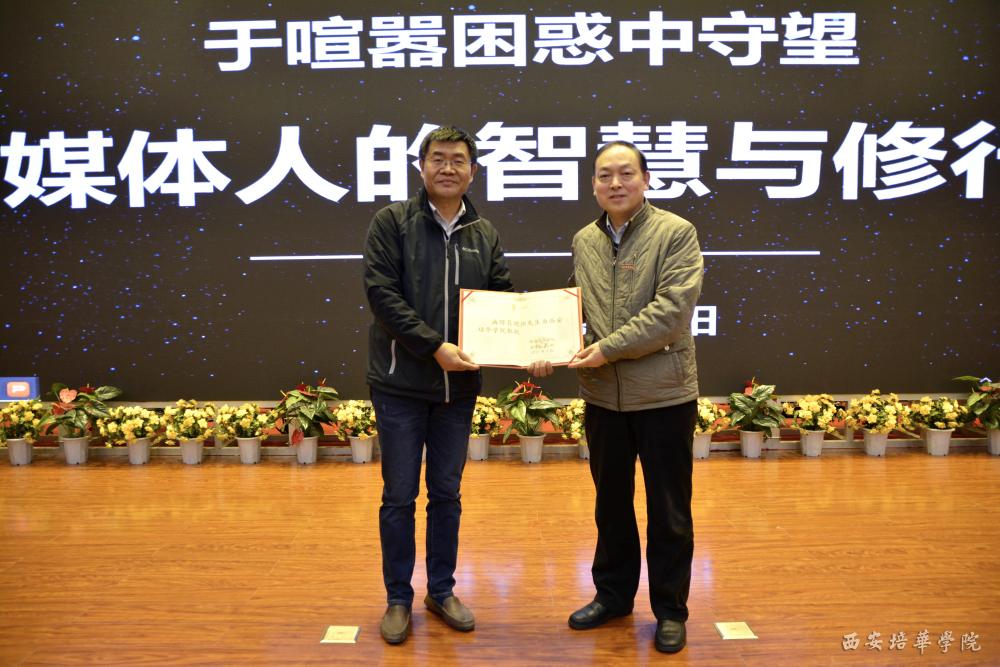 3月27日下午,直击巴格达、耶路撒冷两次长时期战争的战地记者、新华社《瞭望》副总编辑、现长驻联合国日内瓦总部的新华社高级记者聂晓阳做客培华大讲堂,在维之图书馆报告厅为培华学子讲述“媒体人的智慧与修行”,并受聘为我校教授。我校副校长于国亮,传媒学院院长杜耀峰、副院长赵伟等参加了此次讲座。