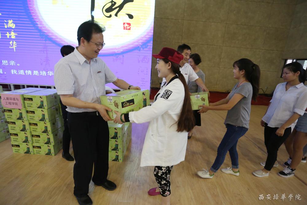 每逢佳节倍思亲,9月14日,在中秋佳节即将到来之际,为使同学们能够过一个温馨的中秋节。西安培华学院在体育馆开展“中秋月圆,情满培华”2016年中秋节慰问活动。姜波理事长、王拴才校长、刘越莲副校长、姚文静副校长、徐国富副校长到场为学生们发放中秋月饼,使全校学子都能感受到培华大家庭的温暖。