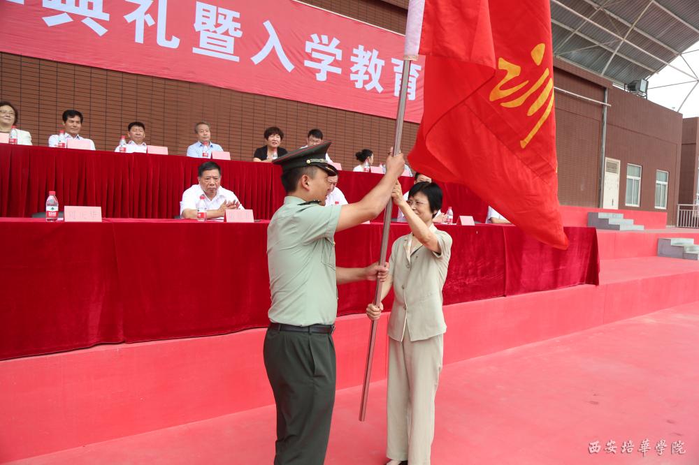 副校长于国亮教授宣读《西安培华学院2016级新生入学教育实施方案》,党委书记周庆华向军训团授旗, 军训团团长王刚少校宣读军训工作计划。 教官代表彭飞同志作表态发言,他表示军训期间将服从命令,听从指挥,文明施训,坚决完成军训任务。