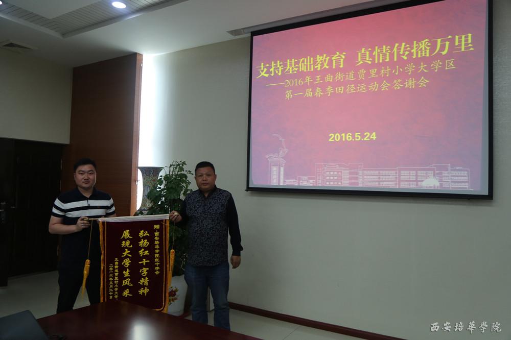 5月24日,2016年王曲街道贾里村小学大学区第一届春季田径运动会答谢会在我校明德楼第一会议室内召开。王曲街道贾里村东片党支部书记孟令平、王曲街道贾里村监委会主任田辉、王曲街道中心学校校长李占民、皇甫小学校长雷小爱、鱼包头小学校长王天宁,我校理事长姜波、副校长徐国富、校长办公室副主任李建、团委工作部部长屈先锋、红十字会指导老师赵子瑜以及红十字会志愿者代表30余人参加了本次会议。