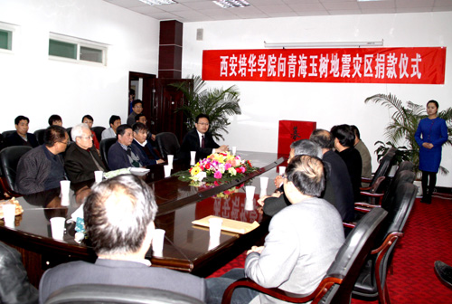 4月20日下午,“西安培华学院为青海玉树地震灾区捐款仪式”在长安校区会议室举行。姜波理事长、王斗虎书记、陈明华院长以及陈胜秋、杨定君、段茂贤、王根性、刘应南、姜朗等校领导出席仪式并带头捐款。各院(部)、处(室)相关同志参加仪式并代表本部门捐献了爱心款。