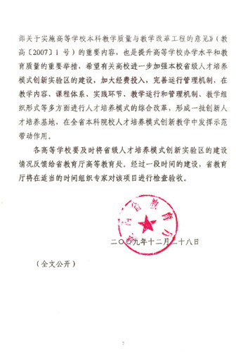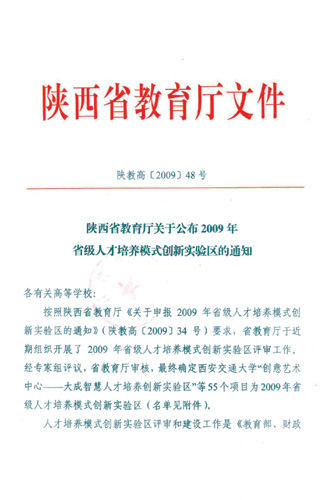 根据省教育厅下发的《关于公布2009年省级人才培养模式创新实验区的通知》(陕教高[2009]48号文件),我校申报的“民办高校法学本科专业应用型人才培养模式创新实验区”被批准为省级人才培养模式创新实验区,这是我校申请获批的第一个省级人才培养模式创新实验区。实验区负责人:李仲达教授。