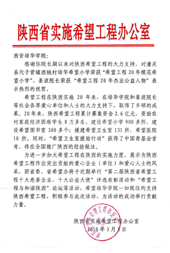 一系列的活动,都体现了一直致力教育事业的培华学院也从未间断过对爱心事业的关注。培华学院弘扬着大爱无疆的公益精神,树立起关爱民生的公益楷模和时代的榜样。而理事长姜波也在由中国青少年发展基金会主办的“希望工程20年”活动中荣获“希望工程20年 杰出公益人物”殊荣。同时,由我校援建的陕西省潼关县代子营镇西姚村培华希望小学被评为“希望工程20年 模范希望小学”。
