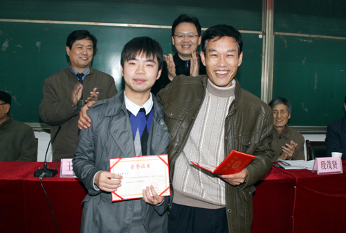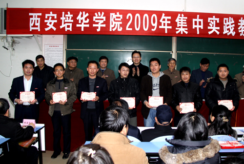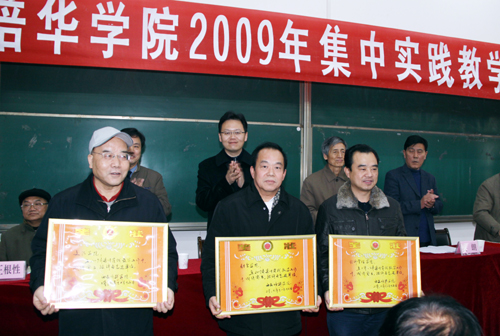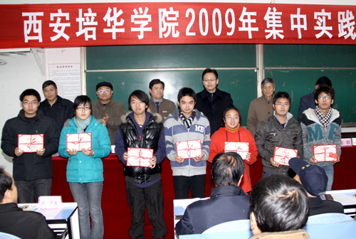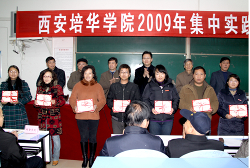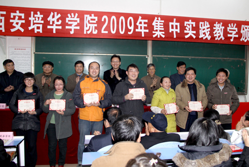 为了进一步激励我校师生积极开展实践教学、强化实践教学效果,学校研究决定,对在2009年集中实践教学活动中取得优异成绩的单位和表现突出的学生及教师予以表彰,王斗虎书记宣读了《西安培华学院关于表彰二〇〇九年度集中实践教学活动先进团队和个人的决定》。学校领导为获得集中实践教学先进单位、优秀学生和优秀指导教师,以及宣传培华小分队先进集体和先进个人代表颁奖。