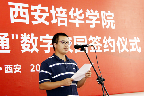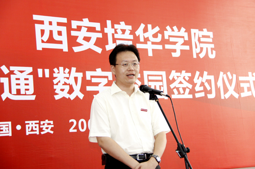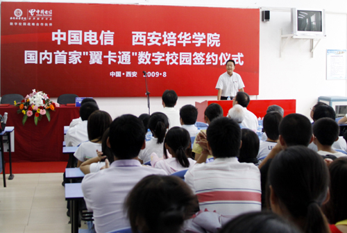 8月28日下午3时,在我校长安校区,中国电信西安分公司副总经理杨青峰与我校院长姜波一起,在阵阵热烈的掌声中走上主席台,签下国内首家“翼卡通”数字校园合约。中国电信西安分公司副总经理门长明、中国电信西安分公司市场部主任赵曼、中国电信长安分公司总经理高成泉,副总经理魏长斌;我校副院长杨定君、段茂贤、王根性及我校200余名师生代表出席了本次签约仪式。仪式由我校院办主任宋伟主持。华商报、陕西日报、西安日报、西安晚报、三秦都市报、陕西电视台、西安电视台等多家媒体到场报道。