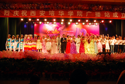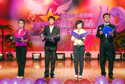 11月20日晚7点,校广播站建站十周年庆典晚会在我校大学生活动中心举行。团委书记赵君慧老师、杨东海老师、广播站前站长翟敏莹老师及我校相关院(系)处(室)领导到场观看。西北大学、陕西电子科技大学、西安财经学院等兄弟院校广播站的负责人也到场祝贺。