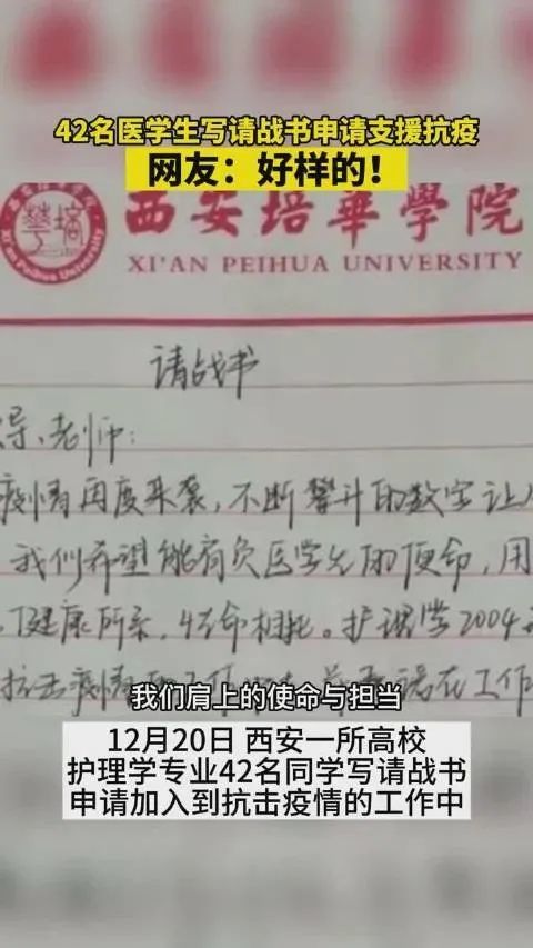 12月20日,陕西西安一所高校护理学专业的42名同学写请战书,申请加入到抗击疫情的工作中。一名学生称作为医学生要承担起肩上的使命与担当,奉献一份“青年力量”。