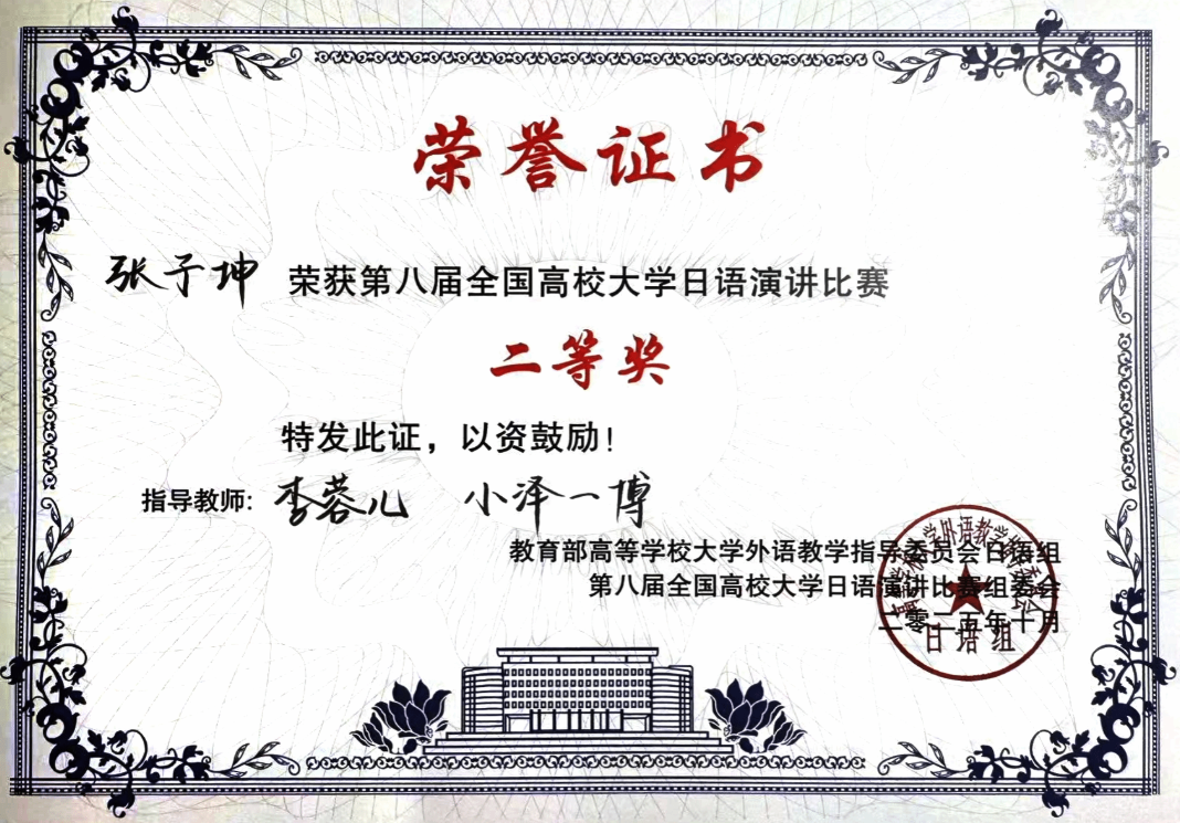 这份荣誉离不开国际教育学院日语专业指导教师就命题解析与表达技巧训练的系统指导,获奖不仅展现了张子坤同学的个人实力,也体现了学校日语教学水平的不断提升和人才培养质量的持续增强。