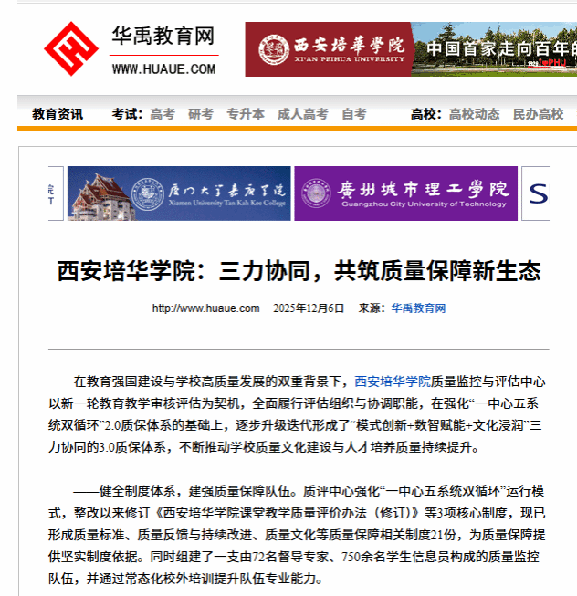 在教育强国建设与学校高质量发展的双重背景下,西安培华学院质量监控与评估中心以新一轮教育教学审核评估为契机,全面履行评估组织与协调职能,在强化“一中心五系统双循环”2.0质保体系的基础上,逐步升级迭代形成了“模式创新+数智赋能+文化浸润”三力协同的3.0质保体系,不断推动学校质量文化建设与人才培养质量持续提升。