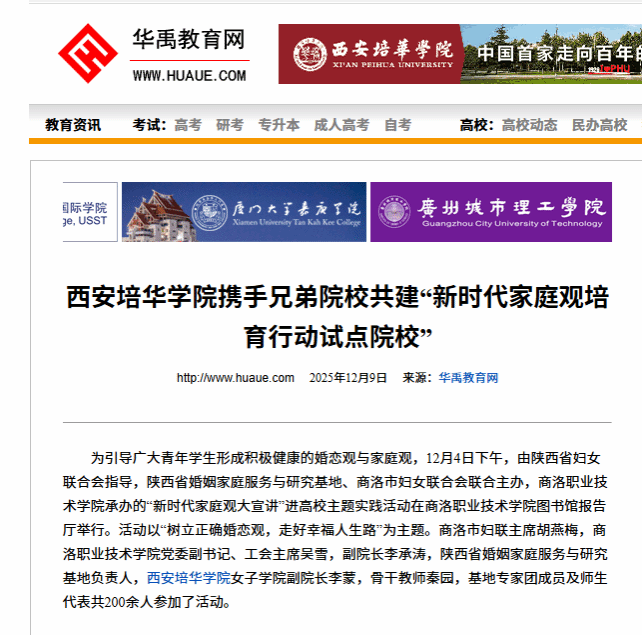 此次活动是西安培华学院积极履行高校社会责任、深化校地融合、服务陕西地方发展的具体体现。依托悠久的办学历史和女子学院的特色平台,学校充分发挥在婚姻家庭研究与服务领域的专业优势,通过省级基地这一重要窗口,将优质教育资源和服务延伸至广阔地域。与商洛职业技术学院的合作授牌,不仅拓展了“新时代家庭观进高校示范院校联盟”的覆盖网络,更为探索跨院校协同育人、资源共享提供了新的范式。未来,西安培华学院将继续在省妇联的指导下,与各方携手,进一步强化政策协同、聚焦文化培育、深化校地合作,持续推动新时代婚姻家庭事业高质量发展。