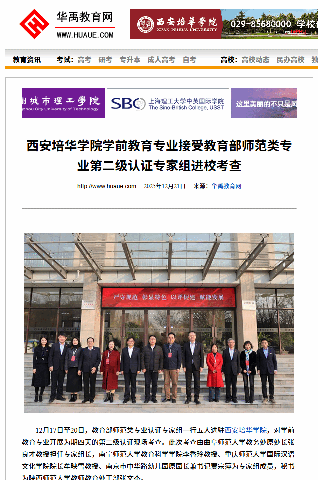 12月17日至20日,教育部师范类专业认证专家组一行五人进驻西安培华学院,对学前教育专业开展为期四天的第二级认证现场考查。此次考查由曲阜师范大学教务处原处长张良才教授担任专家组长,南宁师范大学教育科学学院李香玲教授、重庆师范大学国际汉语文化学院院长牟映雪教授、南京市中华路幼儿园原园长兼书记贾宗萍为专家组成员,秘书为陕西师范大学教师教育处干部张文杰。