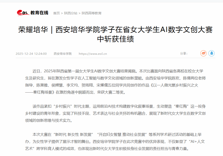 近日,2025年陕西省第一届女大学生AI数字文创大赛结果揭晓。本次比赛面向陕西省各高校在校女大学生及研究生,旨在激发女性学子在人工智能与数字文化领域的创新潜能。由西安培华学院陈欢、陈倩两位老师指导,陈萧雅、侯嫦慧、李文均、贺雨翔、宋秉儒五位同学共同创作的作品《以一人微光燃乡村振兴之火——秦红梅场景》在激烈角逐中脱颖而出,荣获大赛二等奖。