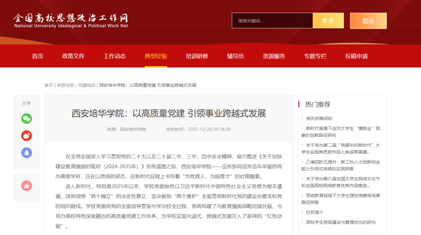 构筑协同矩阵,彰显丰硕成果。学校将红色元素系统性融入校园物质文化与网络文化建设,打造“红色文化长廊” “爱国主义广场”等实体育人阵地,使红色基因在潜移默化中浸润师生心灵。同时依托“网络共学”平台,开发“百年培华校史文化专栏”等系统红色教育微课,实现了线上线下同向发力、课内课外协同育人的立体化“大思政”格局。近三年,学校获批省级思政教育工作质量提升综合改革与精品项目1项;在网络思政、实践育人等领域斩获国家级荣誉5项、省级荣誉23项。特别是在第八届陕西高校大学生网络文化节中,师生共计40项作品获奖,充分展现了培华学子昂扬向上的精神风貌。新增省级课程思政示范课程与精品课程3门、教学团队3个,在第五届课程思政讲课比赛中10名教师获奖。马克思主义学院师生团队更是表现卓越,荣获国家级、省级教学竞赛奖18项,承担多项高级别科研课题,其研究成果3次获得省级领导批示,思政教育的区域影响力与辐射力持续攀升。