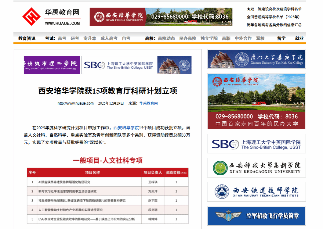 在2025年度科学研究计划项目申报工作中,西安培华学院15个项目成功获批立项。涵盖人文社科、自然科学、重点实验室及青年创新团队等多个类别,获得资助经费总额33万元,实现了立项数量与获批经费的“双增长”。