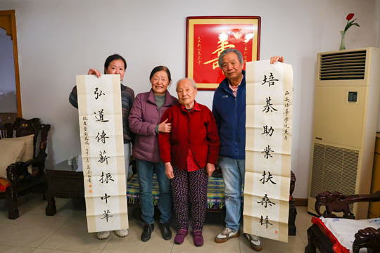 冬日的阳光透过窗棂,静静洒在铺着红布的桌面上。贠奶奶银白的发丝在光中微微发亮,她双手轻颤却坚定,一笔一画写下了“百年培华,欣欣向荣”八个字。那一刻,时光仿佛被阳光拉得很长,很长。