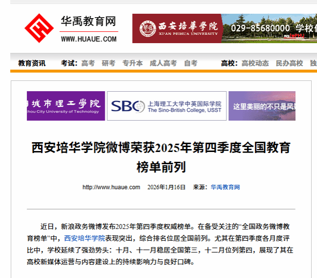 近日,新浪政务微博发布2025年第四季度权威榜单。在备受关注的“全国政务微博教育榜单”中,西安培华学院表现突出,综合排名位居全国前列。尤其在第四季度各月度评比中,学校延续了强劲势头:十月、十一月稳居全国第三,十二月位列第四,展现了其在高校新媒体运营与内容建设上的持续影响力与良好口碑。