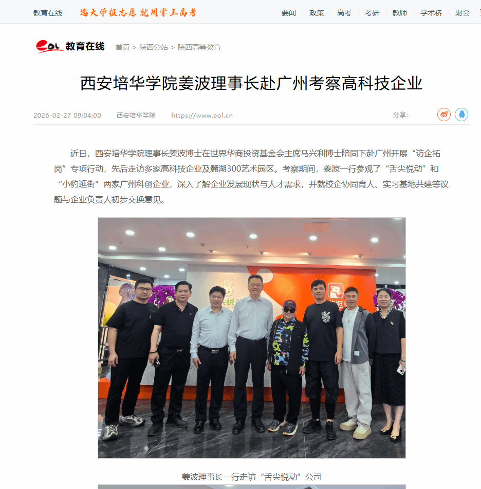 近日,西安培华学院理事长姜波博士在世界华商投资基金会主席马兴利博士陪同下赴广州开展“访企拓岗”专项行动,先后走访多家高科技企业及麓湖300艺术园区。考察期间,姜波一行参观了“舌尖悦动”和“小豹逛街”两家广州科创企业,深入了解企业发展现状与人才需求,并就校企协同育人、实习基地共建等议题与企业负责人初步交换意见。