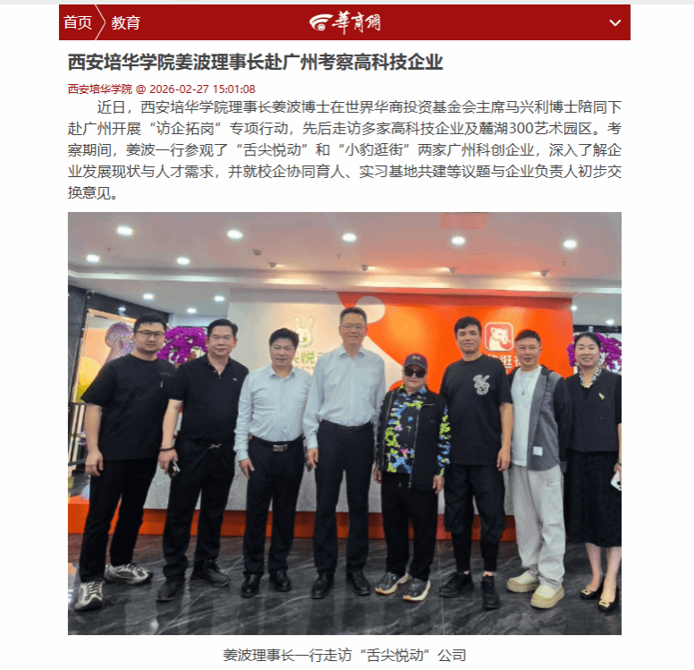 近日,西安培华学院理事长姜波博士在世界华商投资基金会主席马兴利博士陪同下赴广州开展“访企拓岗”专项行动,先后走访多家高科技企业及麓湖300艺术园区。考察期间,姜波一行参观了“舌尖悦动”和“小豹逛街”两家广州科创企业,深入了解企业发展现状与人才需求,并就校企协同育人、实习基地共建等议题与企业负责人初步交换意见。