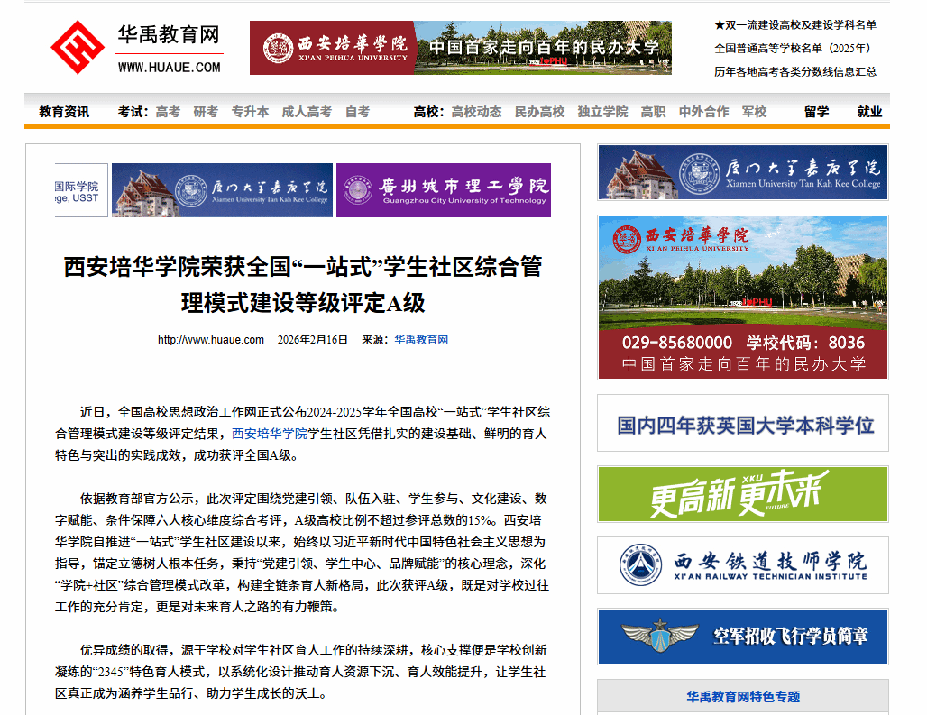 近日,全国高校思想政治工作网正式公布2024-2025学年全国高校“一站式”学生社区综合管理模式建设等级评定结果,西安培华学院学生社区凭借扎实的建设基础、鲜明的育人特色与突出的实践成效,成功获评全国A级。