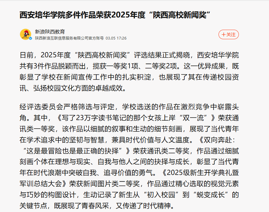 近日,2025年度“陕西高校新闻奖”评选结果正式揭晓,西安培华学院共有3件作品脱颖而出,揽获一等奖1项、二等奖2项。这一优异成果,既彰显了学校在新闻宣传工作中的扎实积淀,也展现了其在传递校园资讯、弘扬校园文化方面的卓越成效。