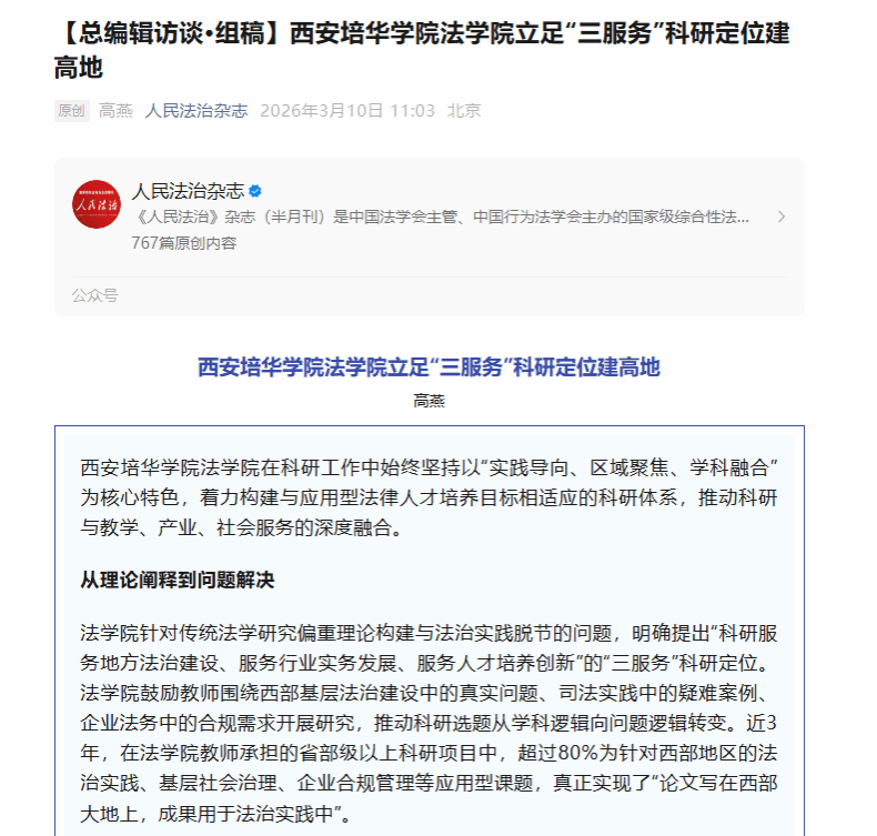 通过持续优化“实践赋能科研、科研引领育人、育人服务社会”的良性循环,西安培华学院法学院旨在建设成为在西部地区具有显著辨识度的法治人才培育基地、实务问题研究高地和决策咨询服务智库,形成可持续、可复制、有影响力的产学研融合“培华范式”。