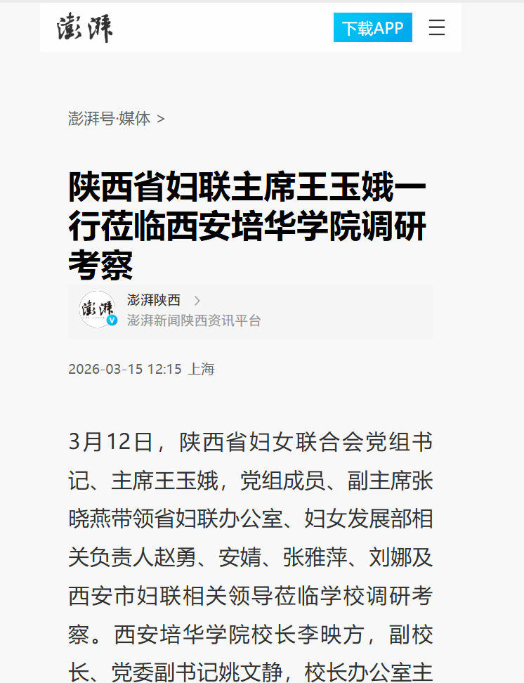 3月12日,陕西省妇女联合会党组书记、主席王玉娥,党组成员、副主席张晓燕带领省妇联办公室、妇女发展部相关负责人赵勇、安婧、张雅萍、刘娜及西安市妇联相关领导莅临学校调研考察。西安培华学院校长李映方,副校长、党委副书记姚文静,校长办公室主任李健,女子学院副院长成立,实验室建设与设备管理中心副主任刘斌,后勤服务中心主任助理王辉等人接待了来宾一行。