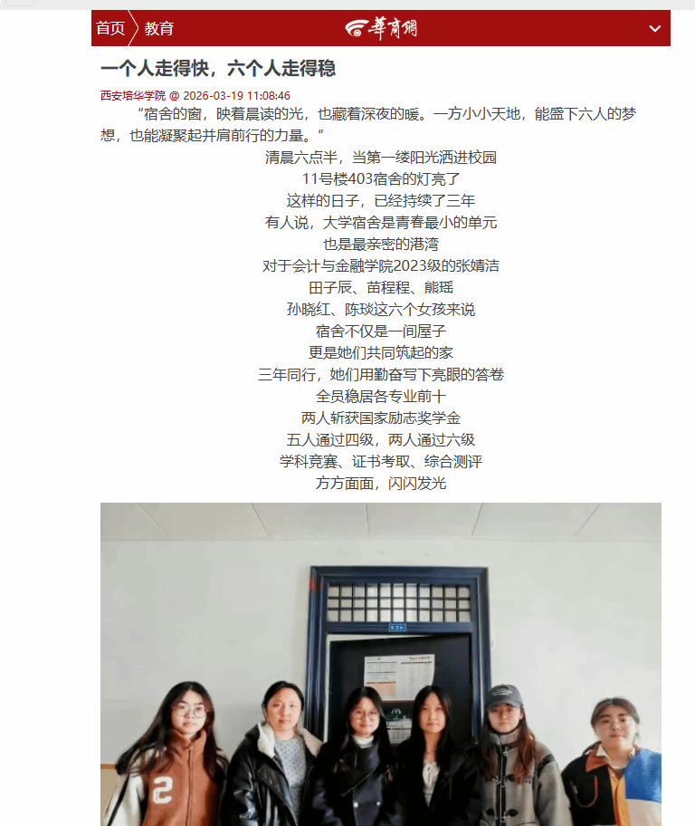 “我们宿舍从来不是一个人在发光,而是你帮我一把、我拉你一下,彼此分享、彼此托底。”“考证达人”陈琰在大学期间先后考取初级会计资格证、教师资格证、计算机二级证书等多张证书。刷题刷到情绪低落时,舍友们的耐心安慰、深夜留的一盏灯,成为她坚持下去的力量。