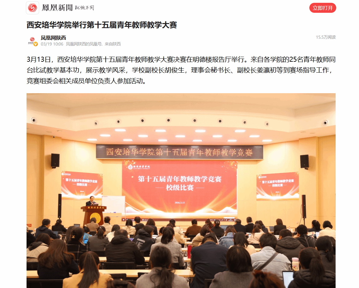 3月13日,西安培华学院第十五届青年教师教学大赛决赛在明德楼报告厅举行。来自各学院的25名青年教师同台比试教学基本功,展示教学风采,学校副校长胡俊生,理事会秘书长、副校长姜瀛初等到赛场指导工作,竞赛组委会相关成员单位负责人参加活动。