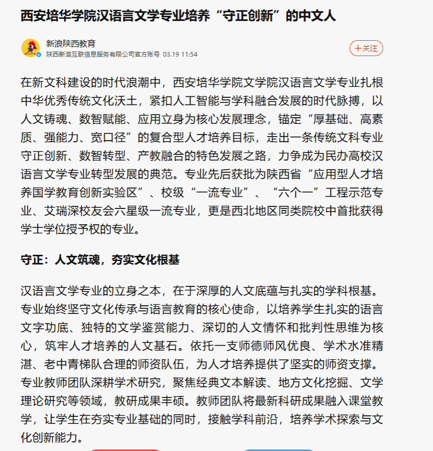 在新文科建设的时代浪潮中,西安培华学院文学院汉语言文学专业扎根中华优秀传统文化沃土,紧扣人工智能与学科融合发展的时代脉搏,以人文铸魂、数智赋能、应用立身为核心发展理念,锚定“厚基础、高素质、强能力、宽口径”的复合型人才培养目标,走出一条传统文科专业守正创新、数智转型、产教融合的特色发展之路,力争成为民办高校汉语言文学专业转型发展的典范。专业先后获批为陕西省“应用型人才培养国学教育创新实验区”、校级“一流专业”、“六个一”工程示范专业、艾瑞深校友会六星级一流专业,更是西北地区同类院校中首批获得学士学位授予权的专业。