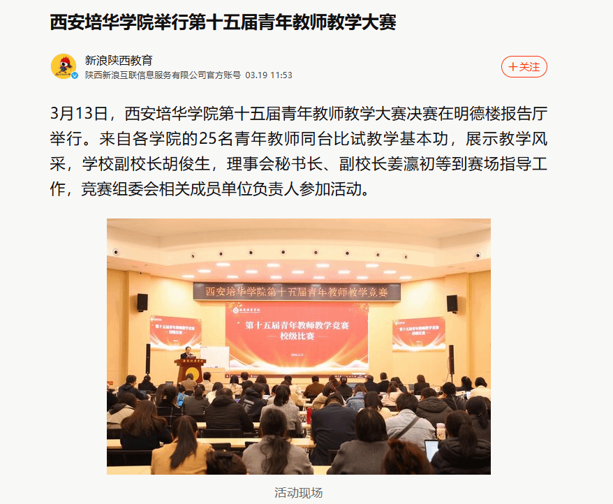 3月13日,西安培华学院第十五届青年教师教学大赛决赛在明德楼报告厅举行。来自各学院的25名青年教师同台比试教学基本功,展示教学风采,学校副校长胡俊生,理事会秘书长、副校长姜瀛初等到赛场指导工作,竞赛组委会相关成员单位负责人参加活动。