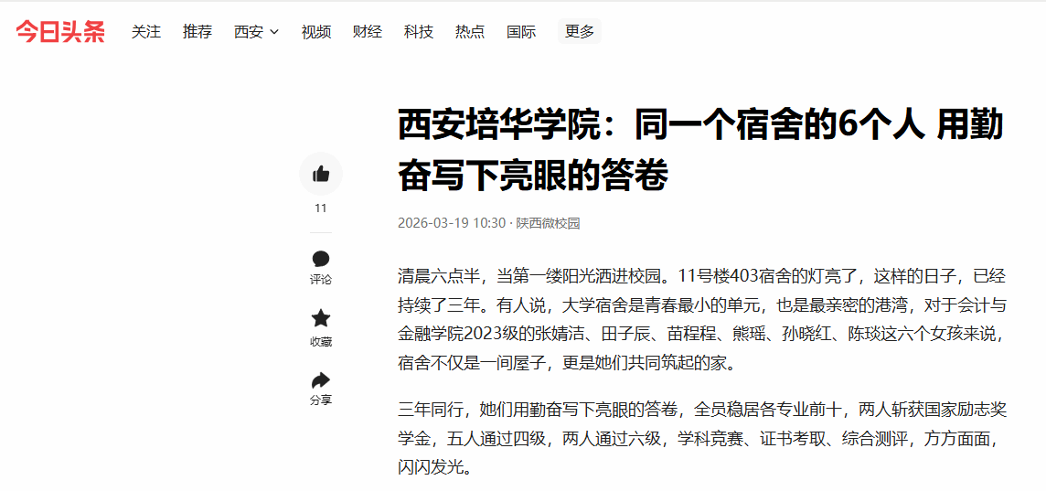 今日头条:西安培华学院:同一个宿舍的6个人 用勤奋写下亮眼的答卷