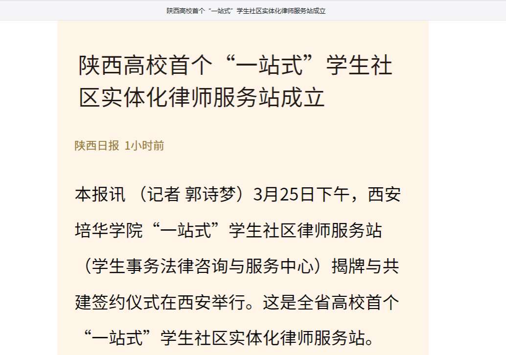 本报讯 (记者 郭诗梦)3月25日下午,西安培华学院“一站式”学生社区律师服务站(学生事务法律咨询与服务中心)揭牌与共建签约仪式在西安举行。这是全省高校首个“一站式”学生社区实体化律师服务站。