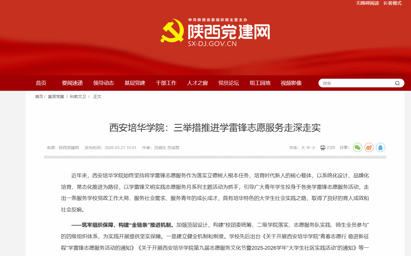 近年来,西安培华学院始终坚持将学雷锋志愿服务作为落实立德树人根本任务,培育时代新人的核心载体,以系统化设计、品牌化培育、常态化推进为路径,以学雷锋文明实践志愿服务月系列主题活动为抓手,引导广大青年学生投身于各类学雷锋志愿服务活动,走出一条服务学校党政工作大局、服务社会需求、服务青年的成长成才,具有培华特色的大学生社会实践之路,取得了良好的育人成效和社会反响。