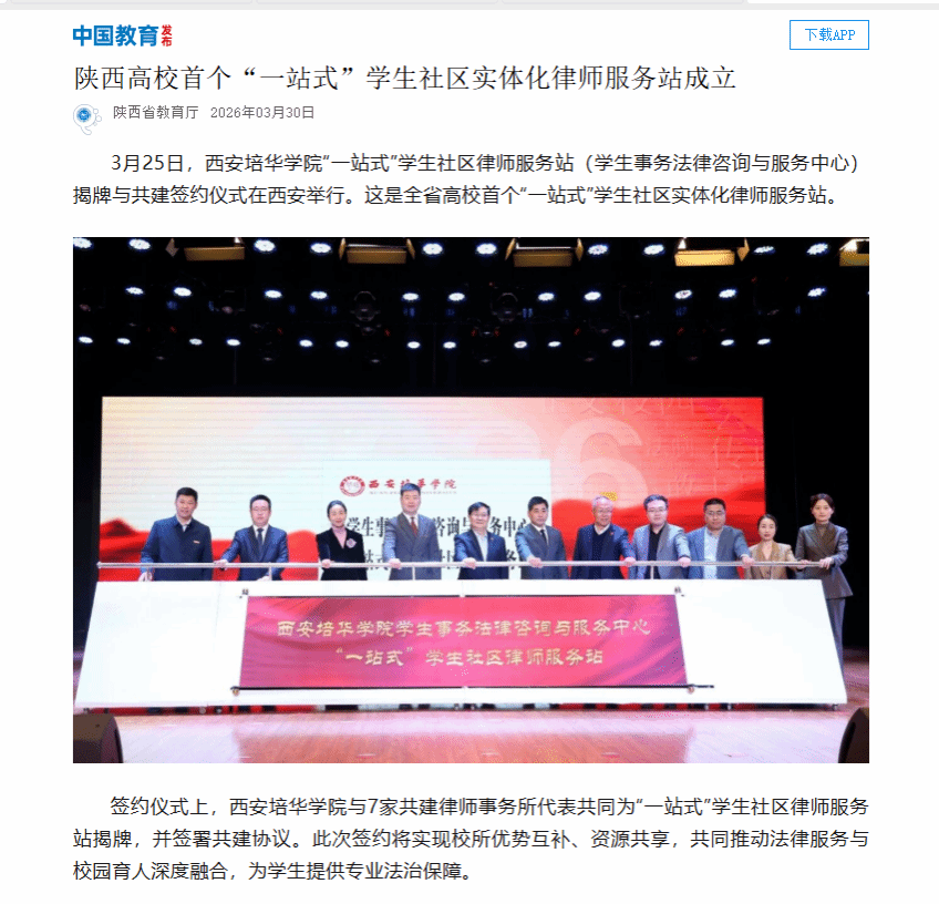 3月25日,西安培华学院“一站式”学生社区律师服务站(学生事务法律咨询与服务中心)揭牌与共建签约仪式在西安举行。这是全省高校首个“一站式”学生社区实体化律师服务站。