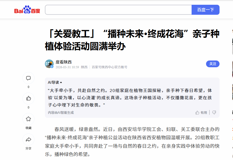 春风送暖,绿意盎然。近日,由西安培华学院工会、妇联、关工委联合主办的“播种未来·终成花海”亲子种植公益活动在陕西省西安植物园温暖开展。20组教职工家庭大手牵小手,共同奔赴了一场与自然的春日之约,在亲身实践中体验劳动的快乐,播种绿色的希望。