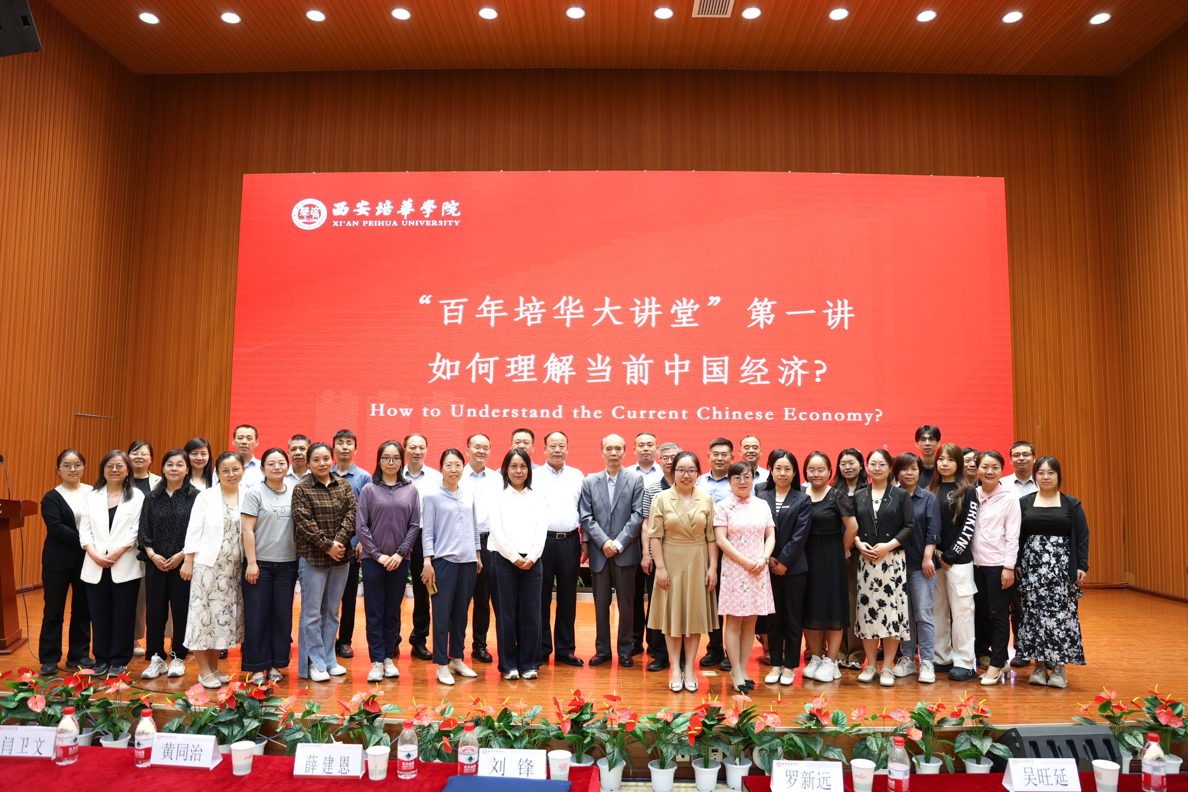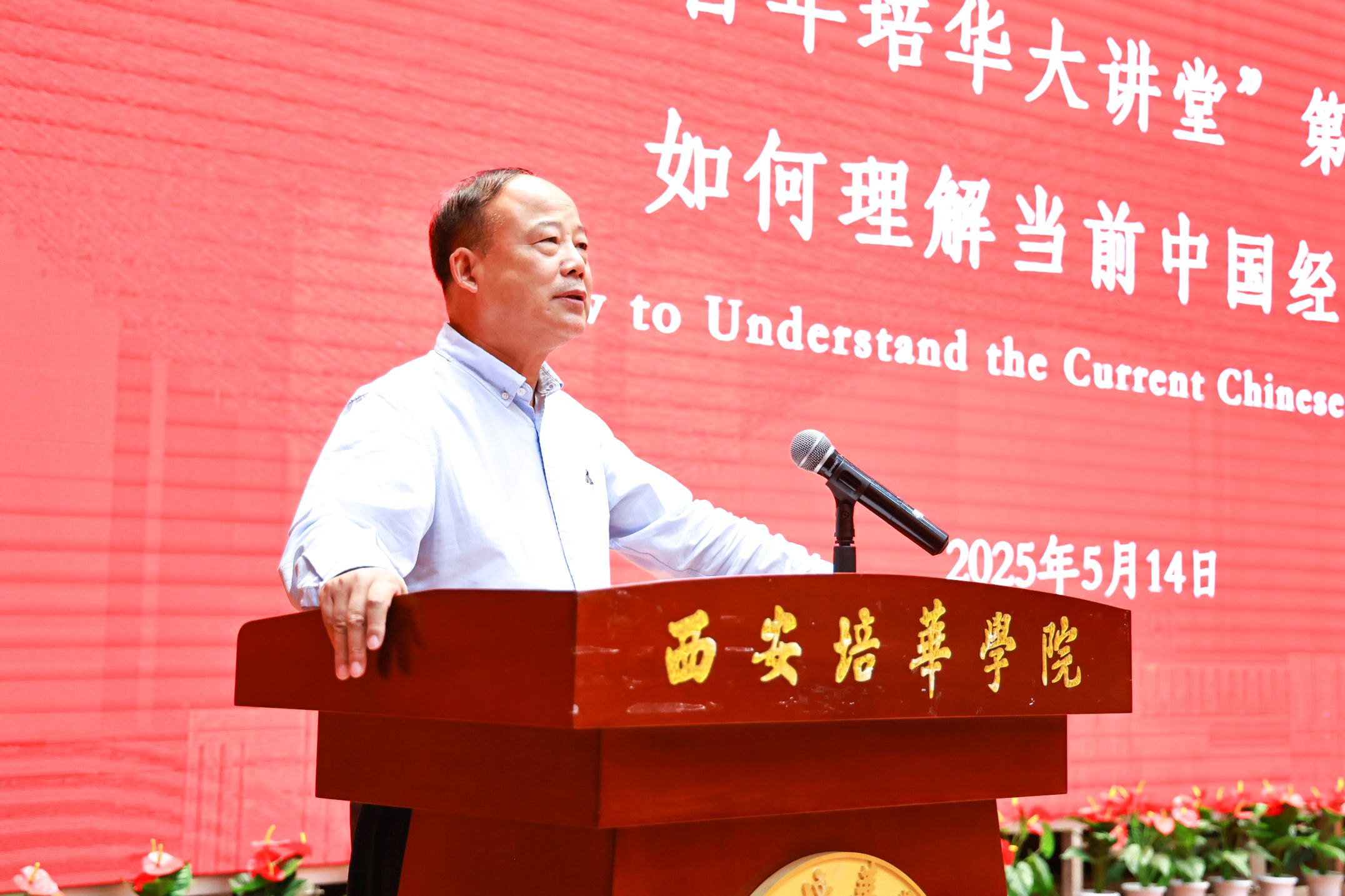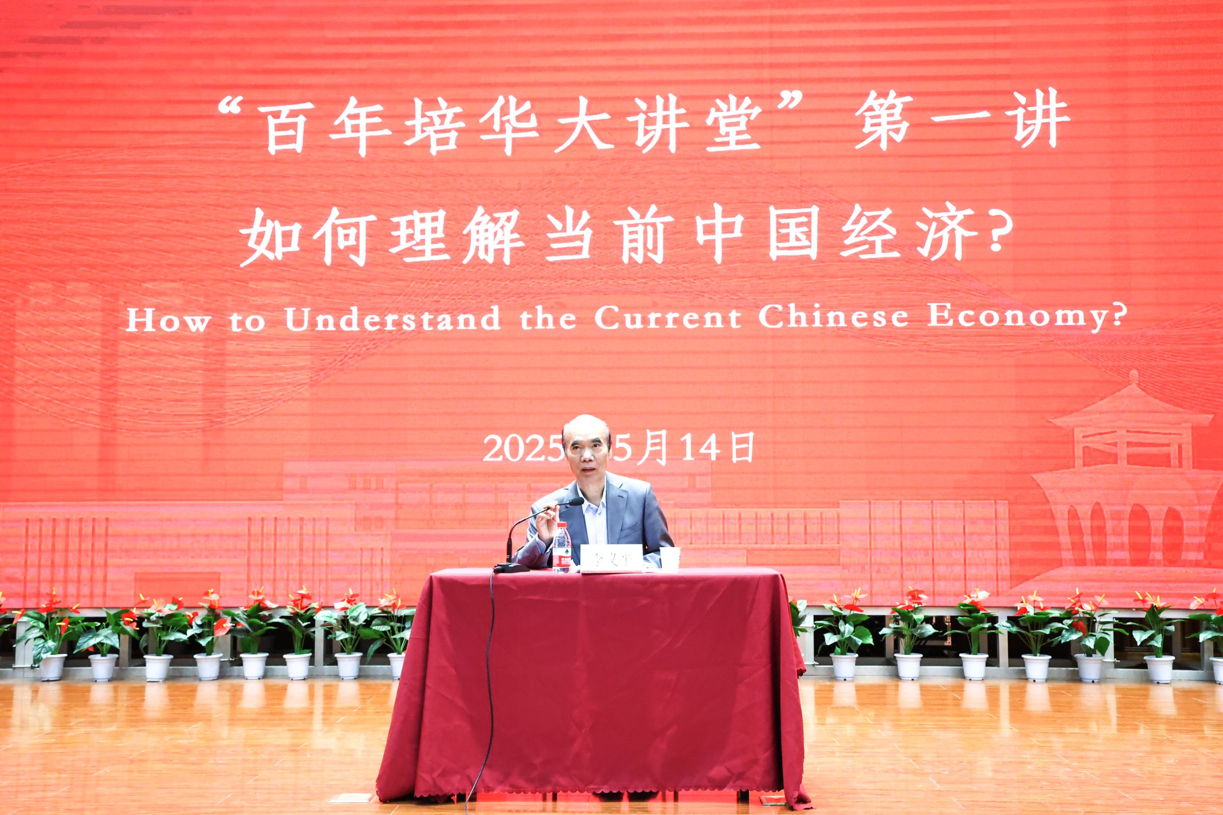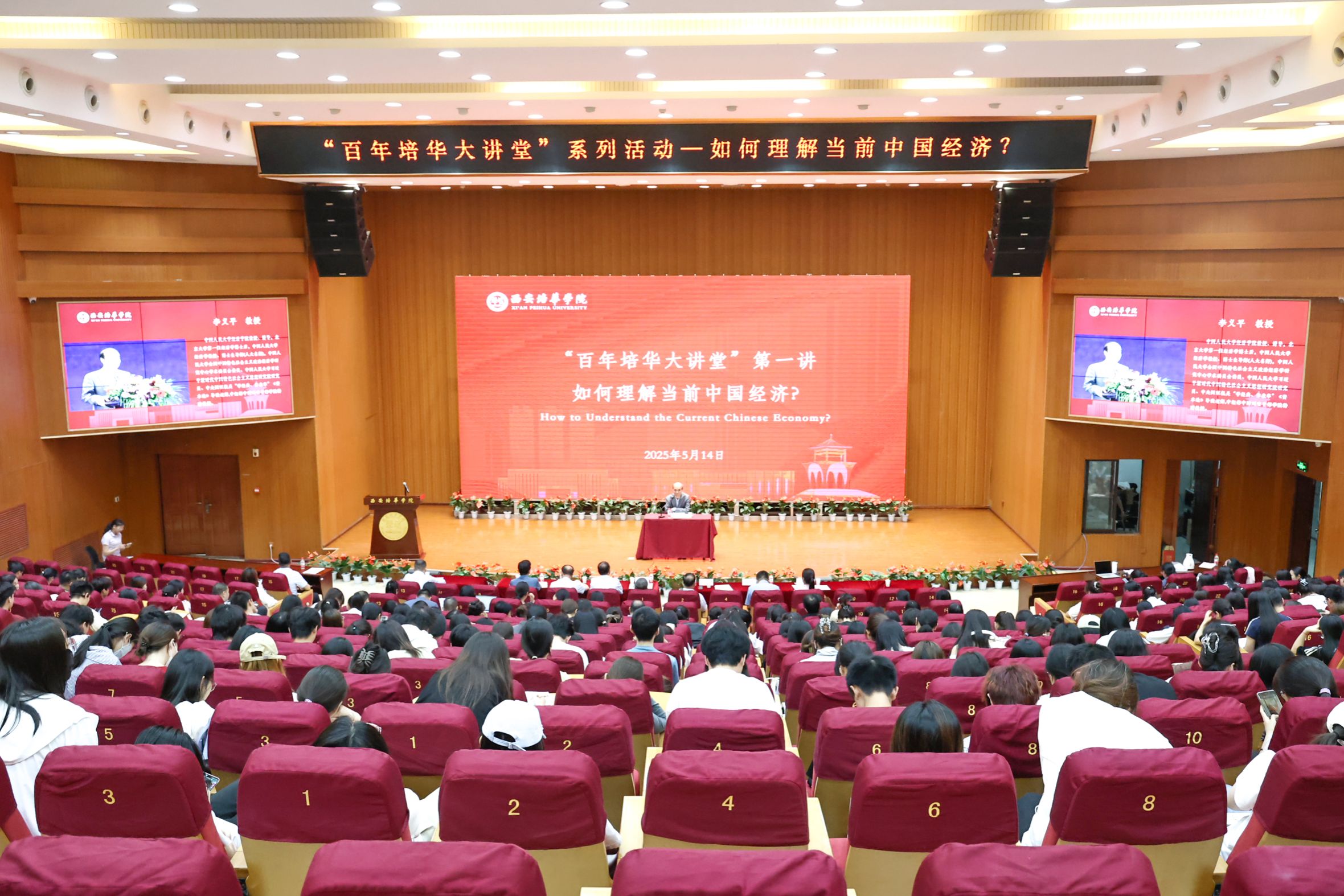 5月14日下午,西安培华学院图书馆报告厅内座无虚席,由西安培华学院会计与金融学院主办,科研管理中心、培华关工委协办的“百年培华大讲堂”系列学术活动正式启幕。首场讲座以“如何理解当前中国经济”为主题,特邀中国人民大学经济学院教授、博士生导师李义平担任主讲嘉宾。李义平教授以深厚的学术造诣和独到的经济洞察,为千余名师生奉献了一场思想盛宴。西安培华学院党委书记刘锋,会计与金融学院院长吴旺延,副院长刘斌、丁阳等校领导出席活动。副校长罗新远主持讲座。