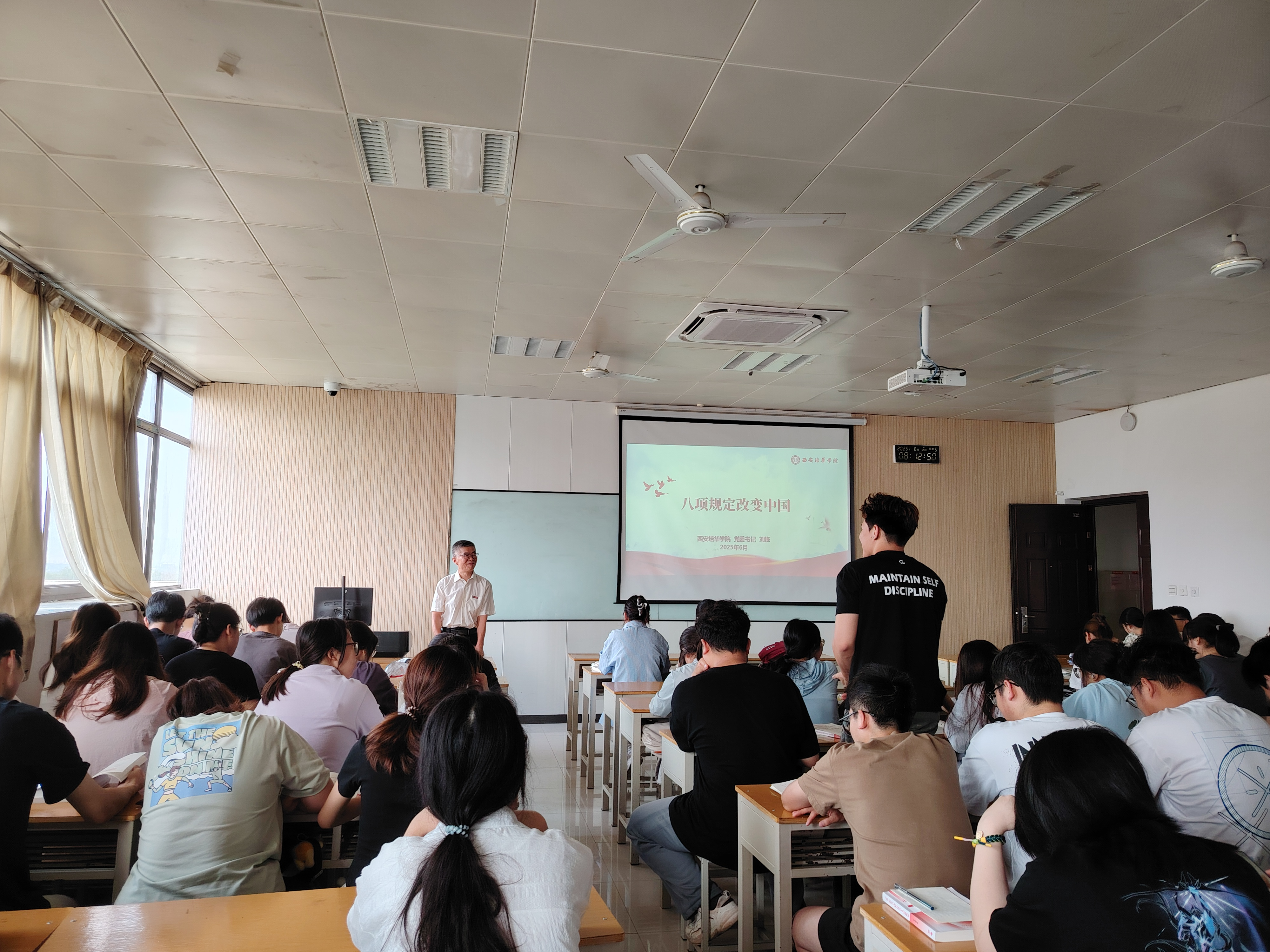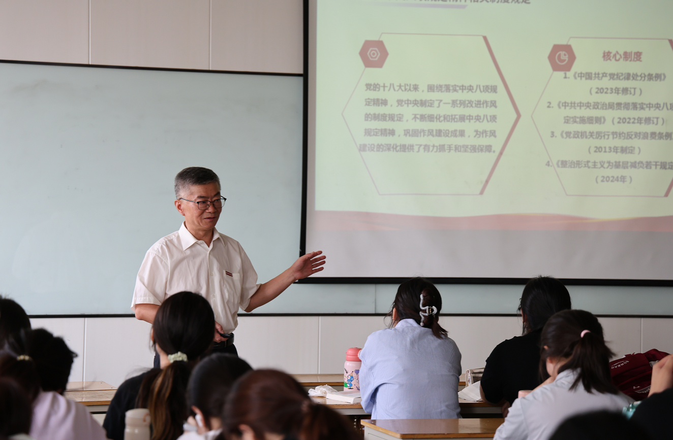 为推动学习贯彻习近平新时代中国特色社会主义思想和深入贯彻中央八项规定精神学习教育的持续深入开展,加强西安培华学院青年大学生的思想政治教育工作,6月5日,校党委刘锋书记以“八项规定改变中国”为主题,在博远楼教室为2023级会计07班,2023级护理专业05、06班的学子上了一堂严肃而生动的思政课。