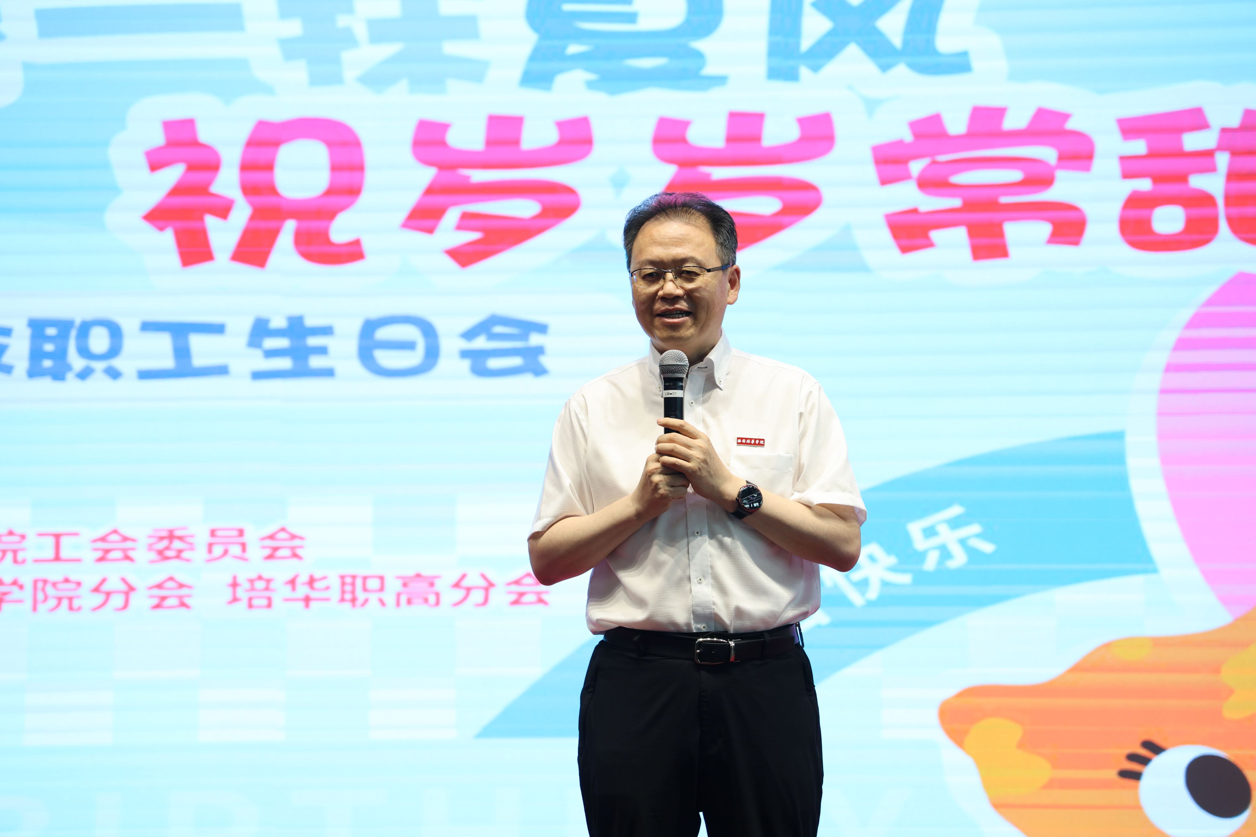 生日会在主持人热情洋溢的开场中拉开帷幕。姜波理事长上台致辞。他向全体生日教职工送上真挚的祝福,并感谢其为学校发展所付出的辛勤努力,希望每一个人都能在培华大家庭中感受到更多的温暖与幸福。