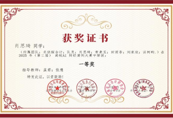 比赛要求参赛团队在规定时间内,针对给定的财经案例,运用AI技术进行深度分析,并提出创新性的解决方案。经过激烈的角逐,“名侦探会计”小组凭借出色的表现,在众多参赛队伍中脱颖而出,取得了国家级一等奖的好成绩。