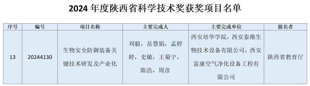 日前,陕西省人民政府公布了《关于2024年度陕西省科学技术奖励的决定》,西安培华学院医学院刘毅博士团队申报的《生物安全防御装备关键技术研发及产业化》荣获2024年度陕西省科学技术进步奖三等奖,实现了学校自然科学类政府奖项的重大突破。