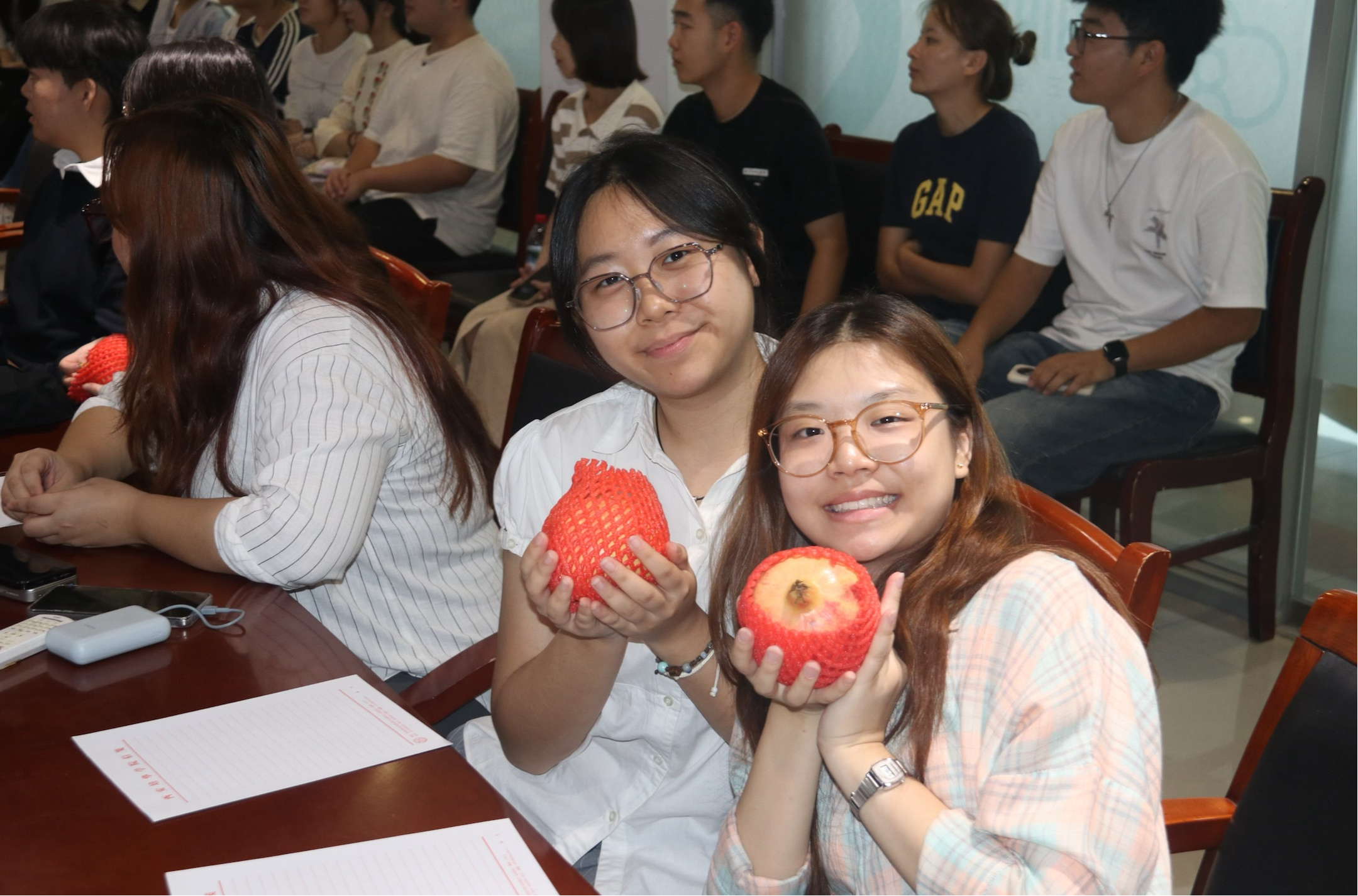 培华师生向新加坡交流学生赠送新鲜石榴,祝福两校紧密联系,合作交流结出丰硕成果。