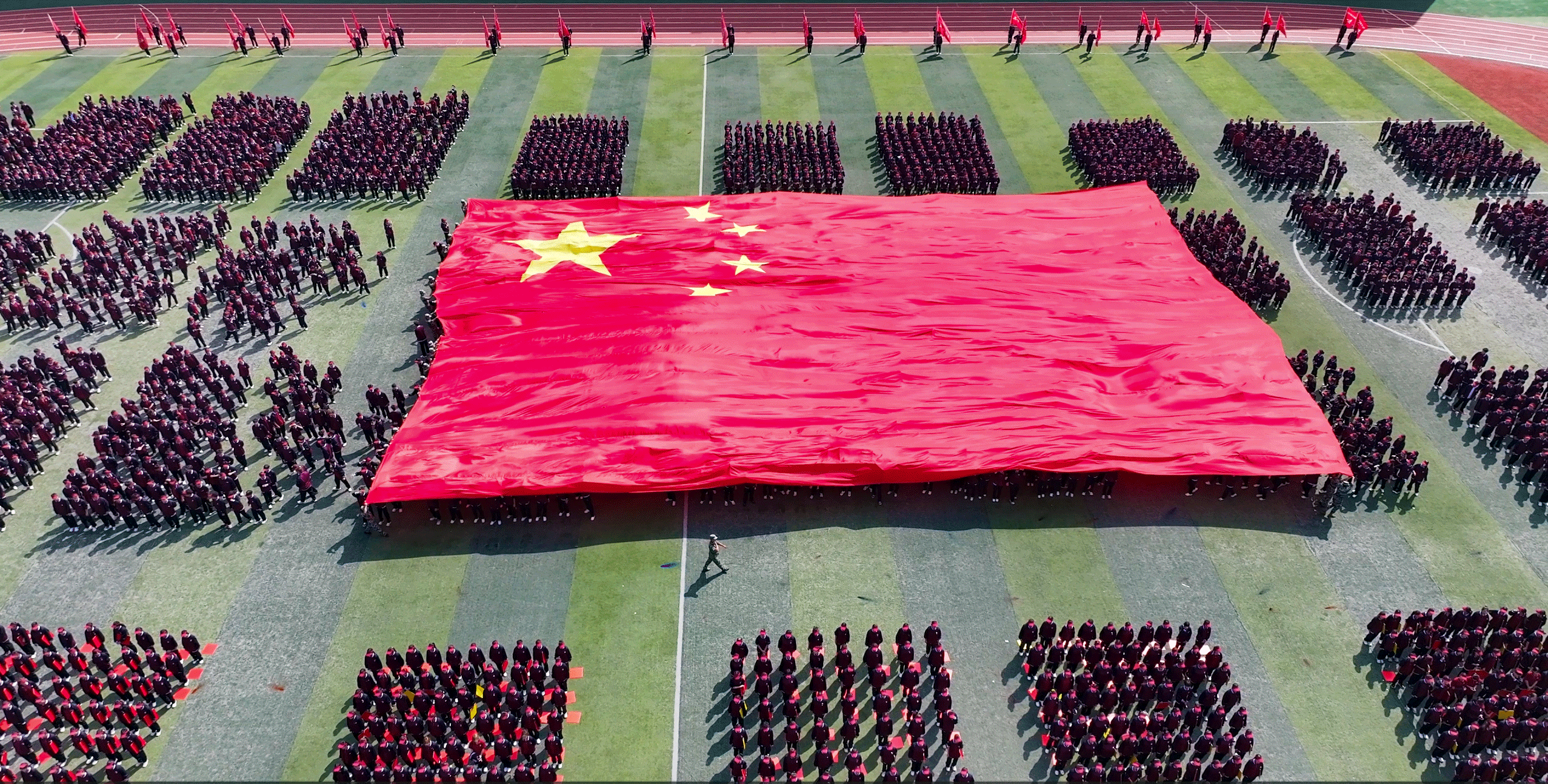 当巨型国旗在歌声中缓缓传递,全场万余人齐声高唱《歌唱祖国》,巨幅国旗由新生传递,歌声如潮,红旗似海,激昂的旋律回荡在教学楼与绿茵场上空,将历史的厚重、青春的朝气与家庭的温情融为一体,这是全体培华人对祖国的深厚感情和美好祝福。