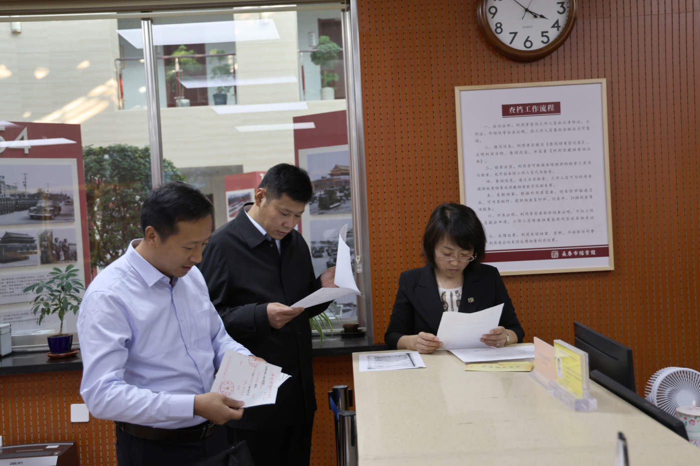 调研组一行在长春工业大学档案馆查阅李铮白老师史料
