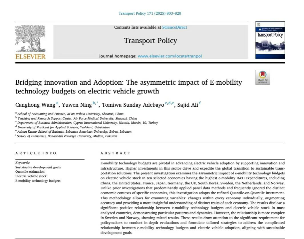 近日,西安培华学院会计与金融学院王仓红博士作为第一作者、学校为第一署名单位的研究成果《Bridging innovation and Adoption: The asymmetric impact of E-mobility technology budgets on electric vehicle growth》在SSCI收录的国际学术期刊《Transport Policy》正式发表。该期刊位列JCR分区一区、中国科学院分区一区Top期刊,2025年影响因子5.3分。