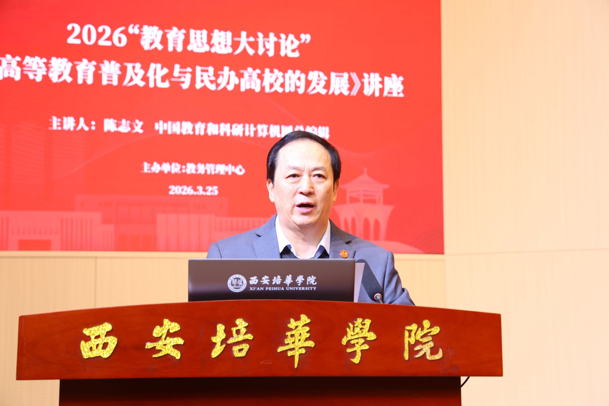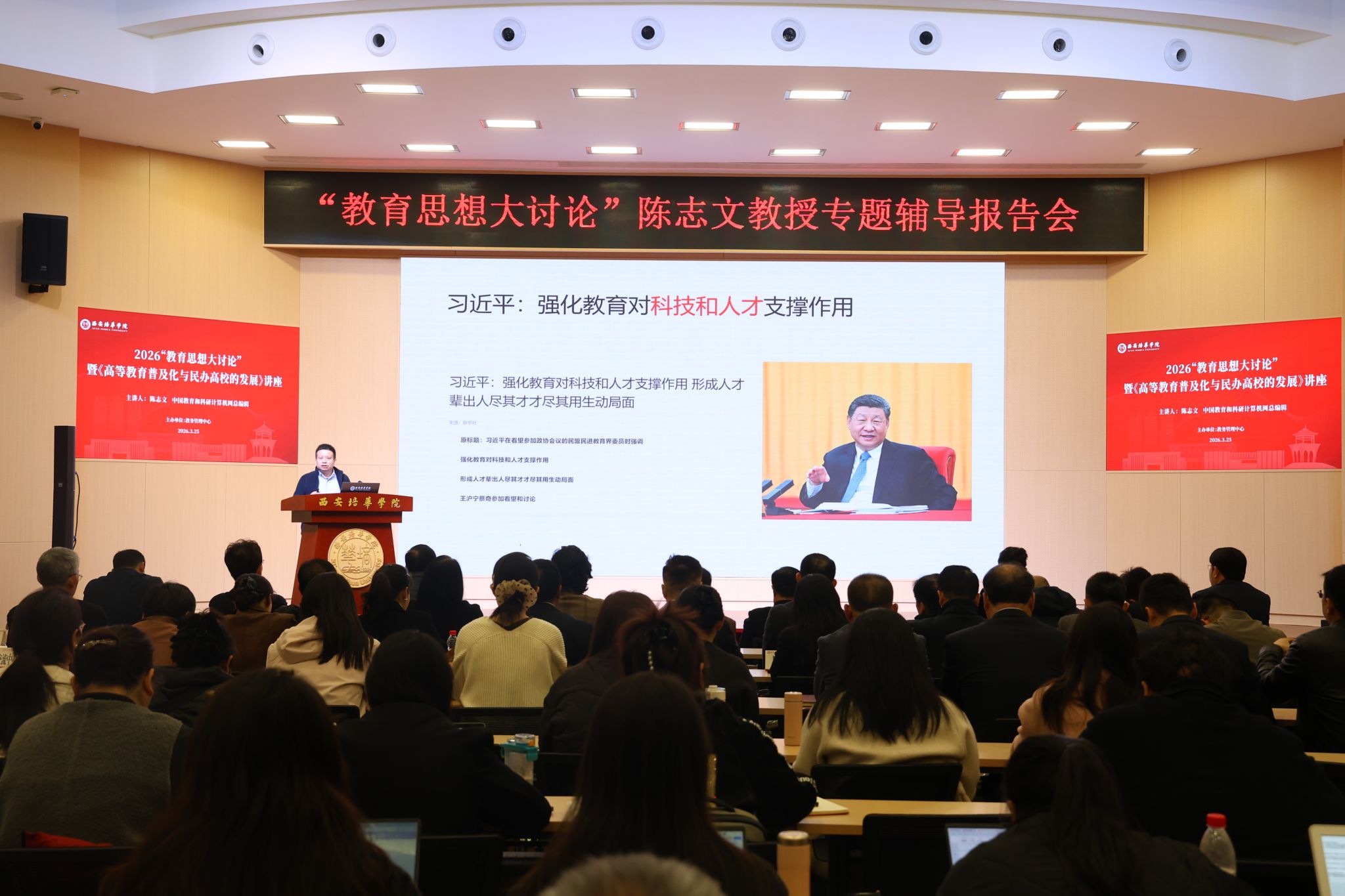 为精准把握高等教育发展新趋势,全面提升学校学科专业建设水平与办学核心竞争力。3月25日,学校在明德楼学术报告厅举办“高等教育普及化与民办高校的发展”专题讲座。本次讲座特邀创新人才教育研究会副会长陈志文主讲,校长李映方,副校长胡俊生、姚文静,理事会秘书长、副校长姜瀛初,校长助理鲍伟,党委副书记蔡亮等出席,各职能部门负责人,各二级学院院长、教学副院长及骨干教师代表参会。