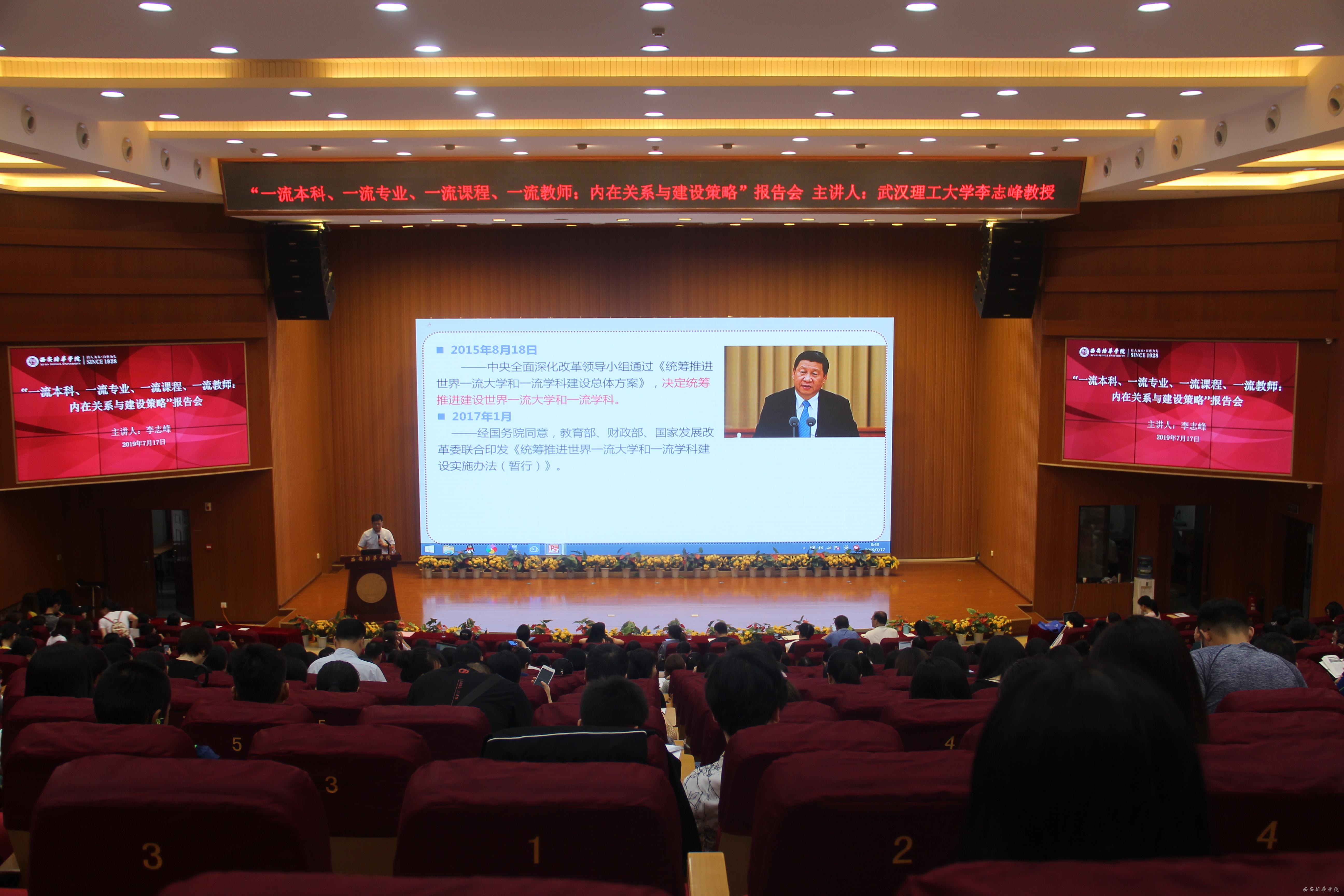 2019年7月17日上午,我校特邀武汉理工大学李志峰教授在图书馆报告厅作了《“一流本科、一流专业、一流课程、一流教师”:内在关系与建设策略》学术报告会。报告会由发展规划与质量建设中心副主任陈来应主持,于国亮副校长、各二级学院院长、全体教师及教学管理人员在图书馆报告厅聆听了此次报告。