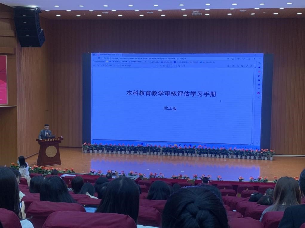 本次培训分为三个层面和两个阶段。三个层面为全体教师、全体教辅人员和中层以上干部;两个阶段为校级培训和院级培训。发展规划与质量建设中心主任赵巍、党委宣传部部长柳雨、教务管理中心副主任王琳、发展规划与质量建设中心主任助理全婧分别就评估常识、自评报告和特色报告,以及学校三大体系育人体系等进行了分享和梳理。