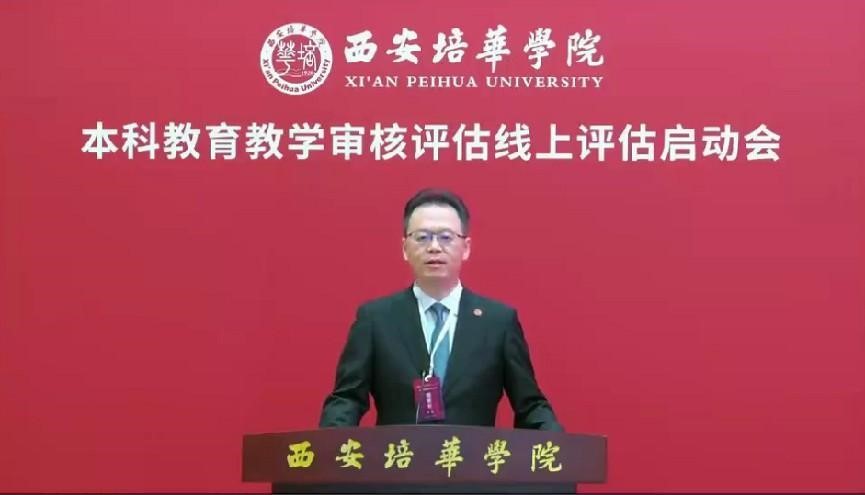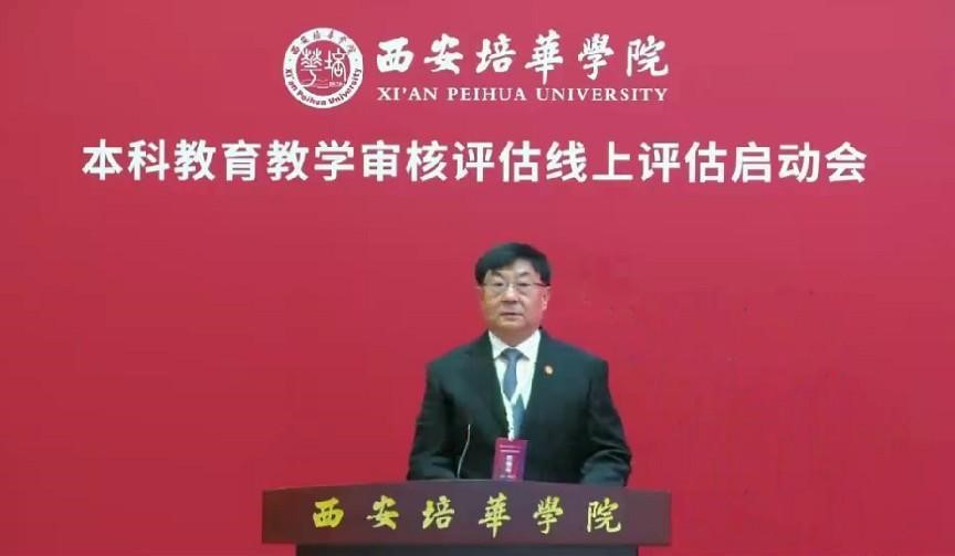 5月15日,西安培华学院本科教育教学审核评估线上评估启动会在明德楼报告厅举行。陕西省人民政府学位委员会秘书长、省委教育工委、省教育厅一级巡视员袁宁,陕西省教育厅高教处处长高强,副处长杨鹏,四级调研员马飞跃,中国西部高等教育评估中心主任陆根书,副主任徐菲,审核评估专家组组长武汉科技大学原党委书记孔建益,副组长安徽师范大学副校长朱家存,专家组成员大连理工大学原副校长朱泓、武汉理工大学原副校长张安富、浙江树人学院原校长徐绪卿、西安外国语大学副校长姜亚军、西北政法大学副校长张荣刚、常熟理工学院原副校长钱素平、山东协和学院副校长孔令桂、贵州师范大学校长助理史秋衡、河南省教育评估中心副主任张新民、北京工业大学教学质量督导评估办公室主任赵曙东、延安大学评估处处长王文东、西安建筑科技大学艺术学院院长蔺宝钢、西安体育学院教务处处长张葆欣出席,西安培华学院全体校领导,党政领导班子成员、校级督导成员近200人参加。