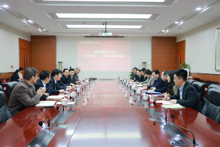 3月26日下午,商丘学院校长程印学一行8人来我校调研交流。我校校长李映方、常务副校长胡俊生、校长助理鲍伟、校办主任李健、发展规划与质量建设中心主任赵巍、人力资源中心主任罗北荣、教务管理中心副主任王琳参加了交流会。