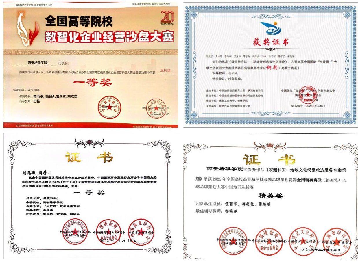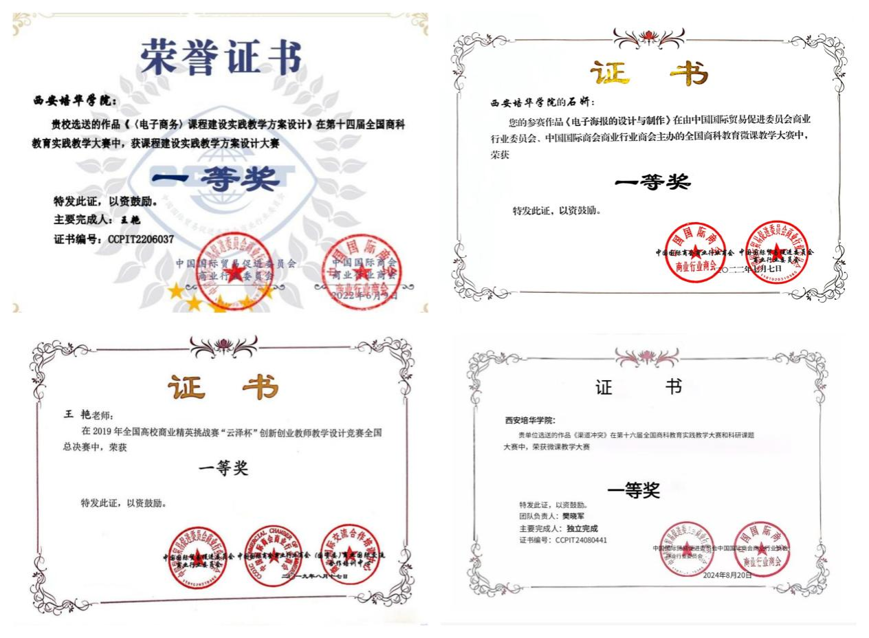 电子商务教学团队2015年获陕西省高等教育教学成果二等奖,2018年应用技术型“T”字型电子商务技能创新创业人才培养体系获省级教学成果二等奖,拥有陕西省精品资源共享课;多位教师在全国教学设计竞赛、应用型人才综合技能大赛、全国商科教学成果认定中获得一等奖。